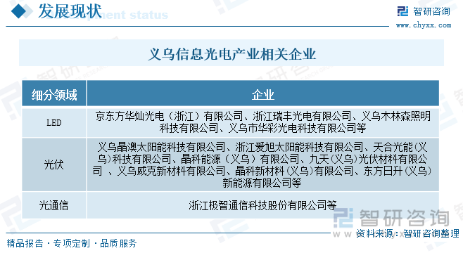以光通信、光电显示、光照明(半导体照明)和光伏为从体的消息光电财产,已成为电子消息财产中高成长、高带动的计谋性财产,具有优良的成长前景,遭到国际财产界的普遍注沉。消息光电财产是义乌市新培育兴起的计谋性新兴财产,财产成长势头迅猛,已成为义乌市主要从导财产之一。义乌市打制了LED、光伏、电子纸等光电财产链,财产成长初具规模,财产集群劣势较着。晶科能源、晶澳太阳能、天合光能等一批世界级光伏企业先后落户义乌。LED财产也集聚了华灿光电、瑞丰光电、木林森照明等一批国内龙头企业,构成了完整的LED芯片、灯具财产链。